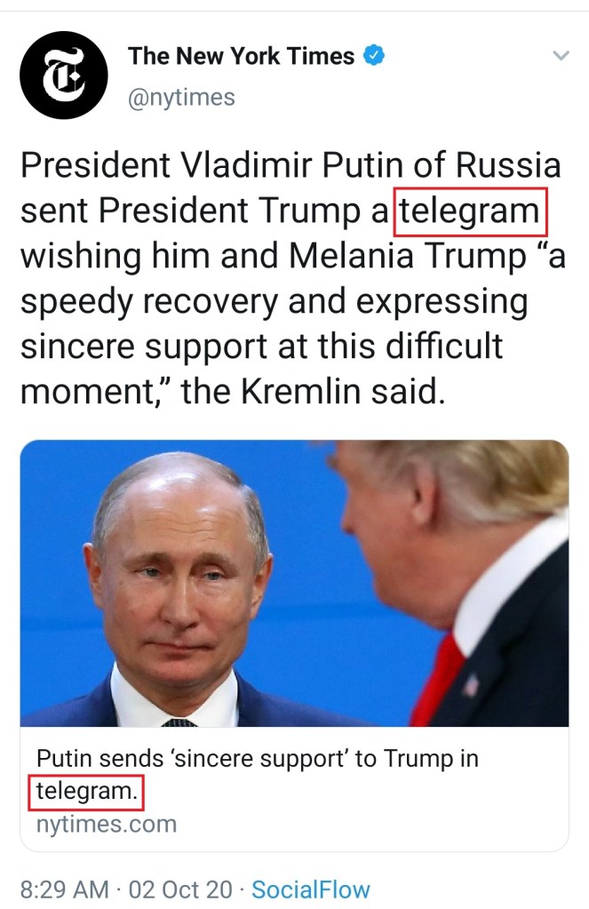 It didn’t surprise me that Putin sent his support. Trump has told us what a great guy Vlad is. More importantly, Vlad would hate to lose his useful idiot in the White House. But who sends telegrams these days? Does the telegram delivery boy still bring it to the front door?