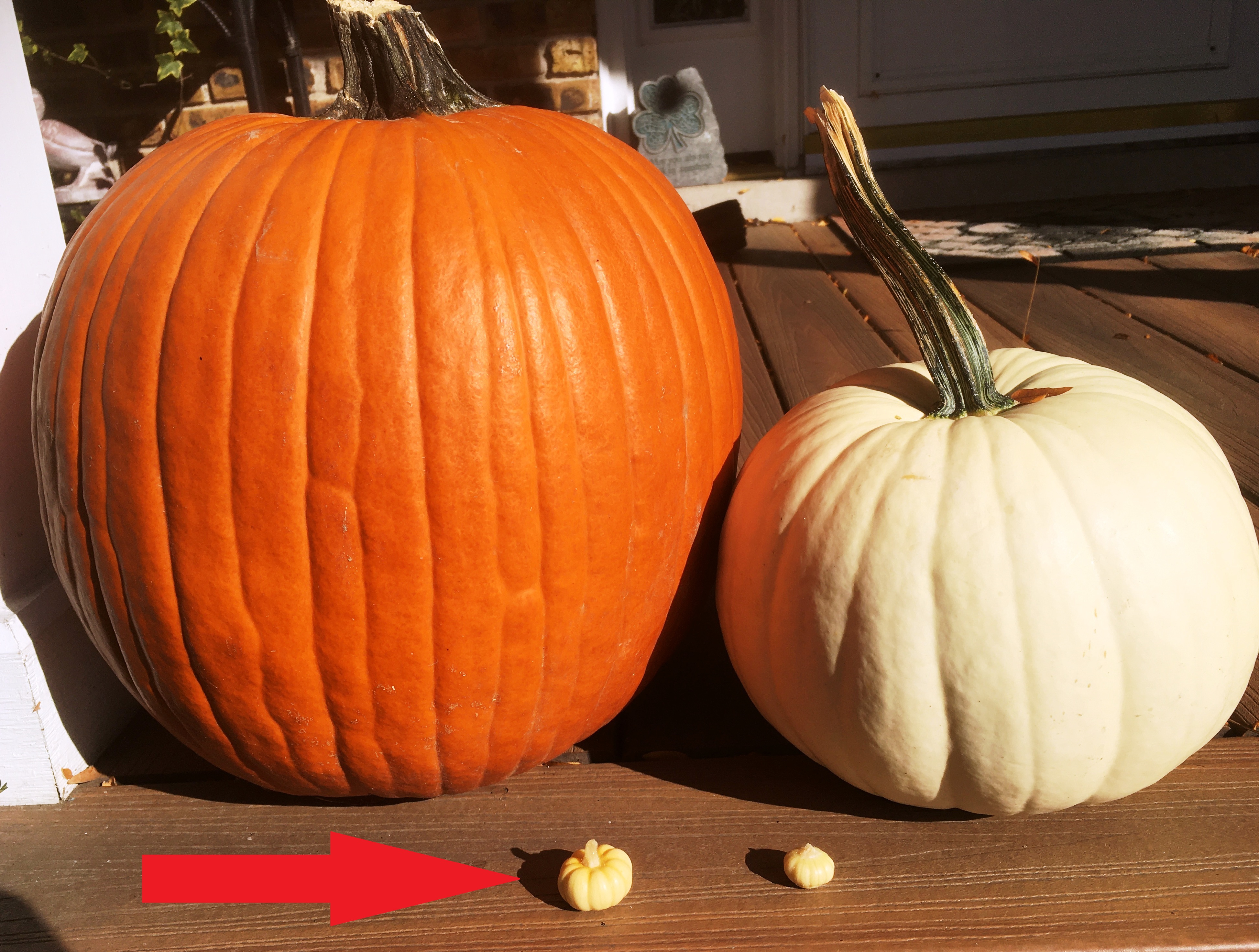 But still, she purchased pumpkins to place on our front porch for Fall decorations. What. A. Waste. I harvested the pumpkins from our garden and placed them in front of the ones my wife had so cavalierly purchased. Take a look. They look great.