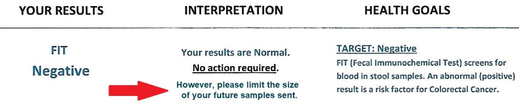 I’m a bit preoccupied thinking about cancer today as a best buddy/brother from another mother gets his colon cancer surgically removed today. His diagnosis scared me into getting a fecal check for colon cancer. I was thrilled to receive some good news, although I didn’t appreciate the editorial comment added.