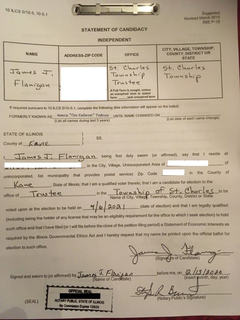 I had to go and open my big mouth at the last Zoom meeting of the St. Charles Township Democrats and ask about whether we were fielding candidates for any St. Charles Township positions in the Spring election. Before I could say “the election is rigged,” I was drafted as a candidate. I figured that there was no way I would actually run since I couldn’t imagine getting the 240 signatures needed to qualify for the ballot. First, global pandemic. Nobody wants to answer their door. Next, it’s cold out. Finally, I’m lazy. As it was, I got about a third. The rest were gotten for me. Gulp. Looks like I’ll be a candidate for St. Charles Township Trustee on April 6, 2021.
