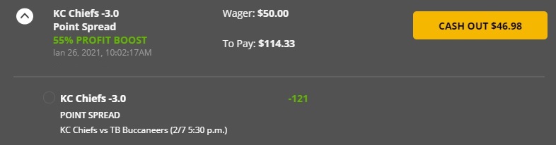 And finally, you will notice the 2 bets above have “cash out” options. These change as the game goes on. If it appears that KC will easily win by more than 3 points, I may take some level of risk and cash out my bet on TB. Let’s say KC is winning 38 – 10 entering the 4th quarter and Tom Brady is hurt. It is unlikely TB will get within 3 points. Maybe a $2 cash out option is offered. I will cash out, and that 2 bucks gets added to my KC winnings.