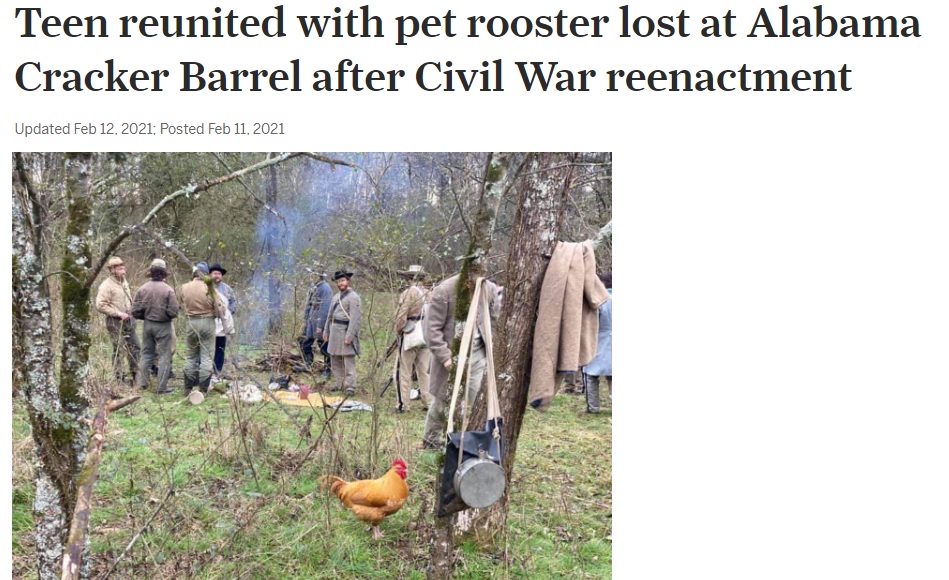 I wish I could say that this happens only in Alabama. Sadly, there are probably 30 more states where something like this routinely happens. Click HERE to link to the full story. A quick recap for those of you that think reading anything from a website about Alabama will make you dumber – a chicken tied to a truck at a Cracker Barrel restaurant escapes and is found.