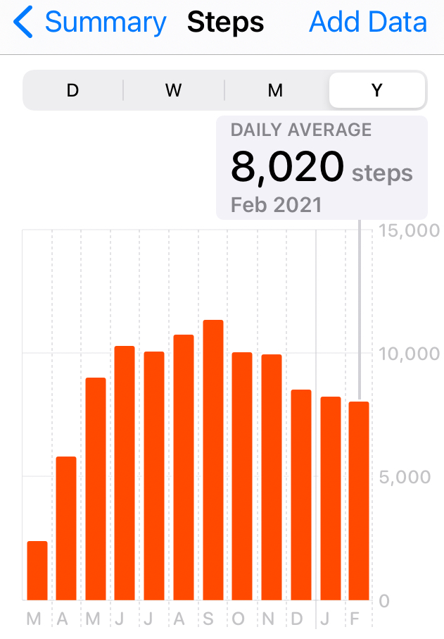 I was limited to walking outside, our treadmill, and our elliptical machine. I never got around to setting up a bike on a stationary trainer like I wanted. Mild winter weather allowed me to still walk outside in December and most of January, but then winter hit here with a vengance in February. We had about 3 weeks straight of incessant snow and frigid temps. I was relegated to shoveling/snowblowing outdoors when necessary (which seemed to be daily) and walking/ellipsing indoors. Take a look at how my steps in February shrank for the third month in a row …