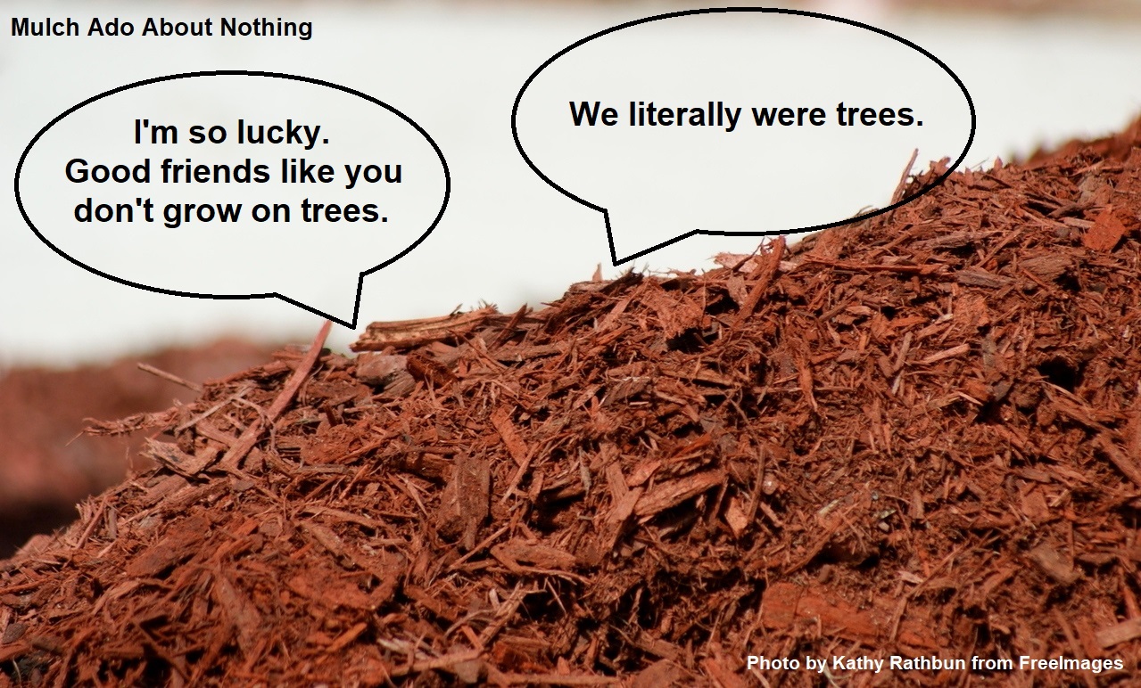 After clearing away weeds, I needed mulch. I hit upon the idea of making my own mulch using a sledgehammer and some soft, rotting tree trunk segments behind my shed. It’s too early in the season for us to get free mulch from the county, and it’s not like I am willing to pay for decomposing wood. Sounds to me like a good spot to segue to a Mulch Ado About Nothing cartoon.