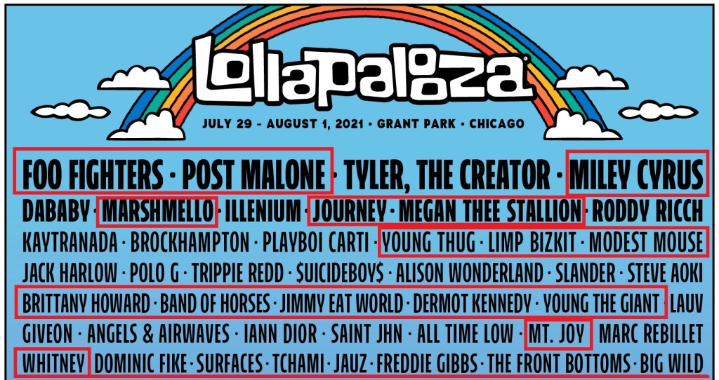 Lollapalooza returns to Chicago in 2021 after being Covid-cancelled in 2020. The line-up for the 3 day music festival has been released. I heard on my transistor radio that you can tell how cool you are by how many rows down the Lolla poster you can recognize acts.