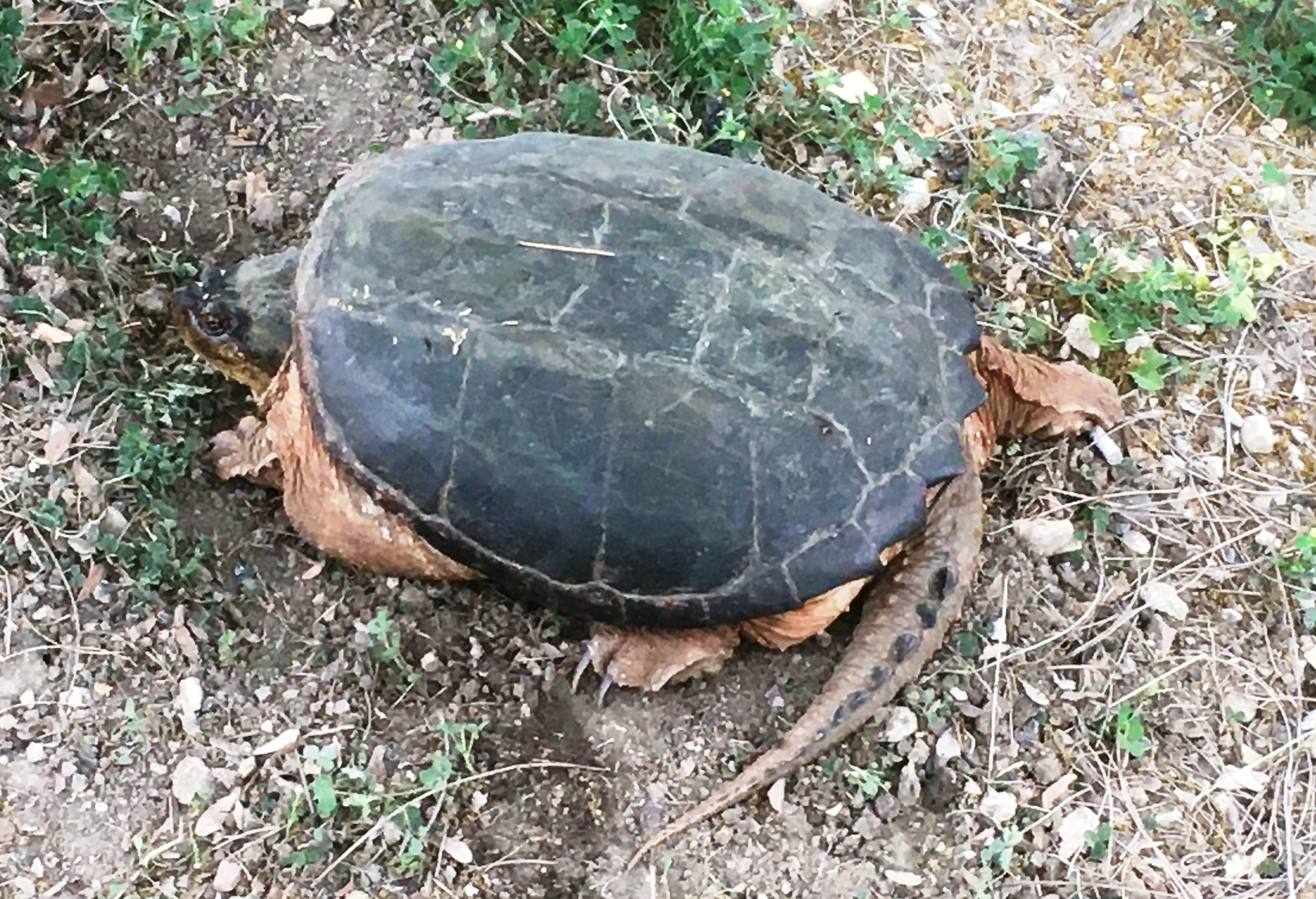 That’s a rather large mama snapping turtle laying her eggs. It happens every year about this time. Turtles come up from the pond nearby and lay eggs among the landscaping in the business park. The young turtles hatch, have no idea where to go, refuse to ask for directions (mostly the males), and many get squished in the business park’s parking lot. When I used to rent a warehouse for my business there, I would do a turtle rescue where I would gather up lost hatchlings and toss them into the pond. I’ll have to plan to walk through the business park over the next couple weeks just in case some turtles need rescuing and tossing.