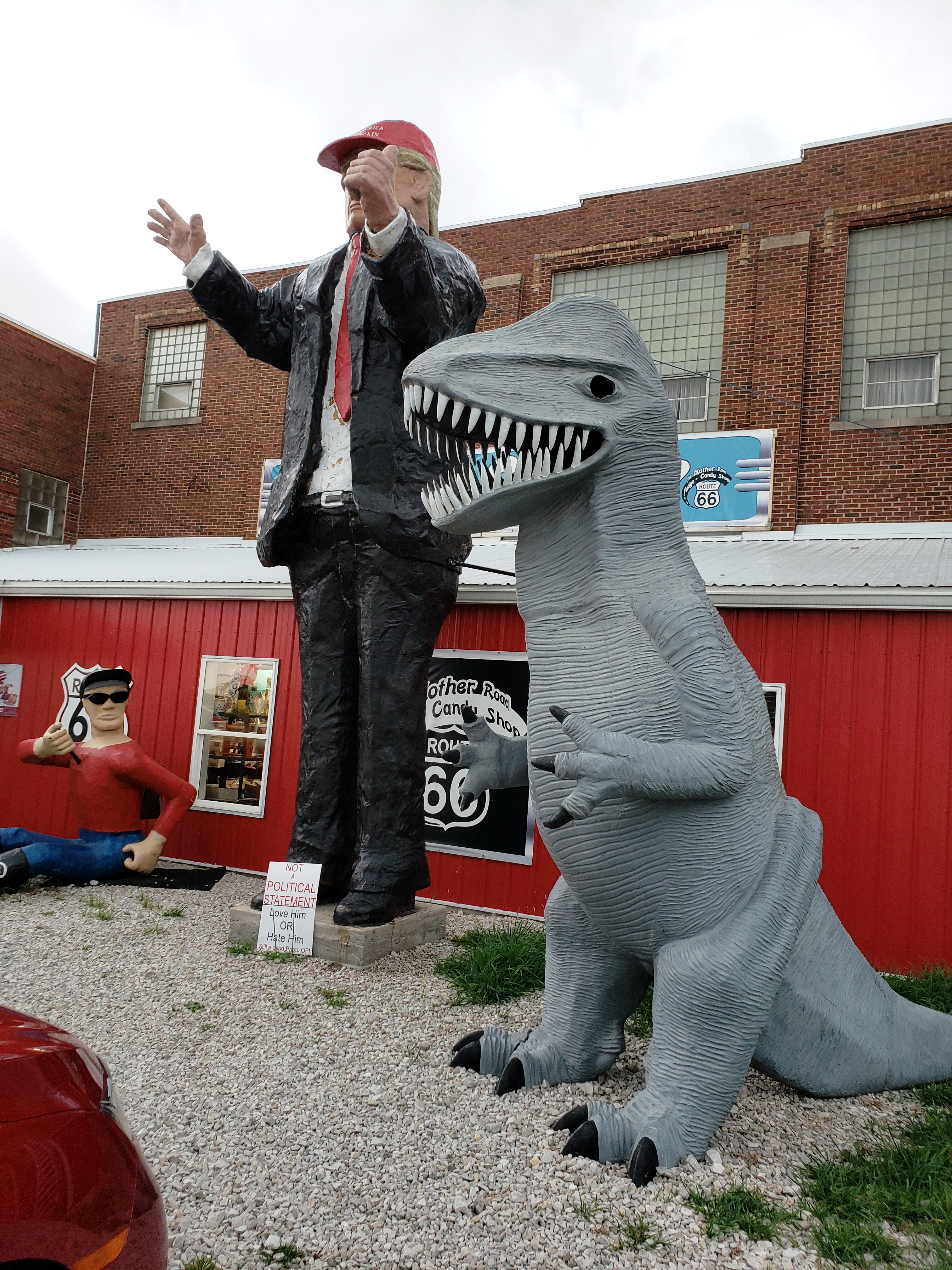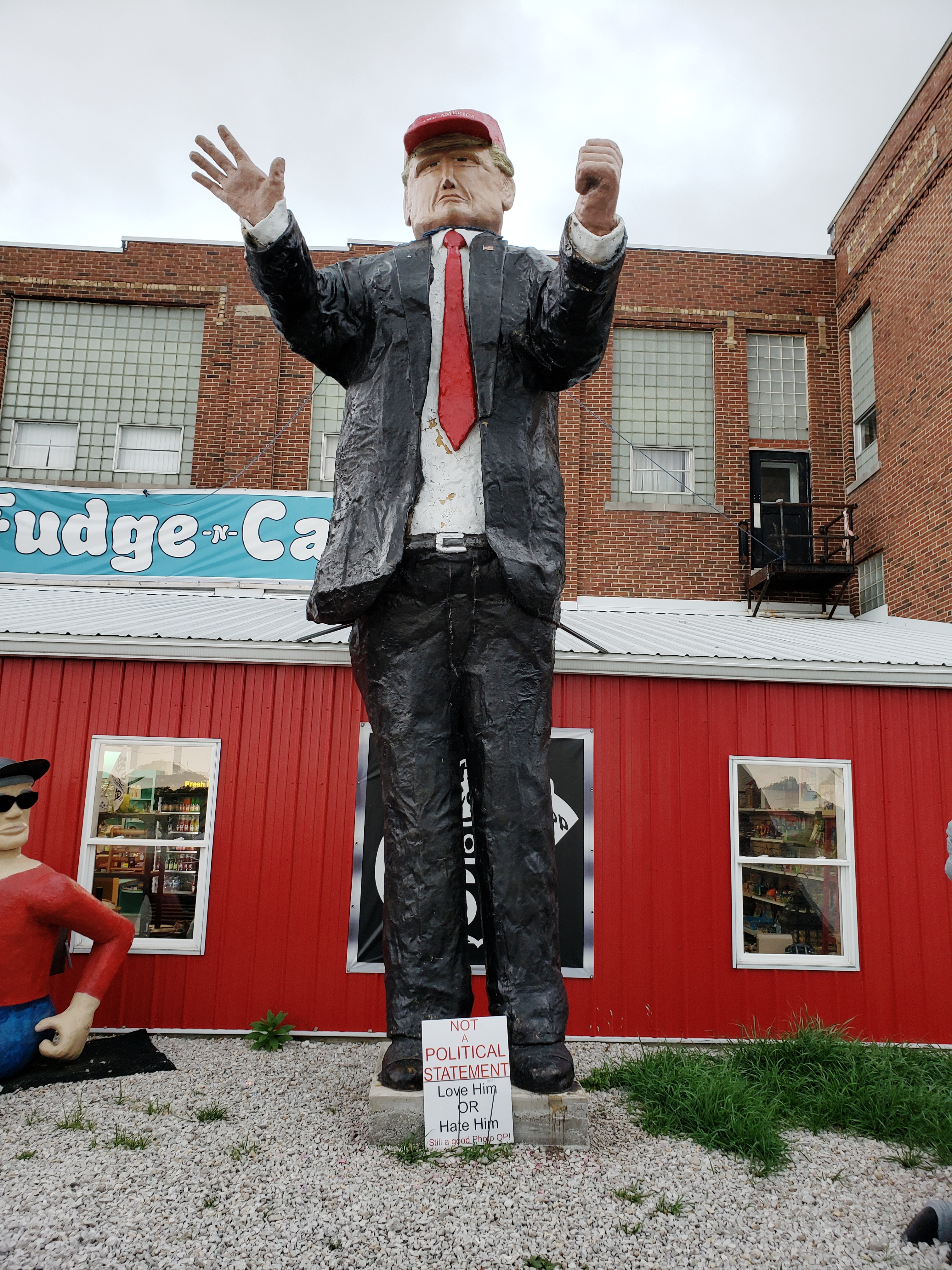 Sorry, but that store is no longer going to be getting my purchases of candy/fudge/antiques/junk. At least they got it right in one way. They placed the Trump statue right next to another dinosaur. Time will tell how well a dinosaur and a jackass will get along. I’ll check back on my next trip later in the summer.