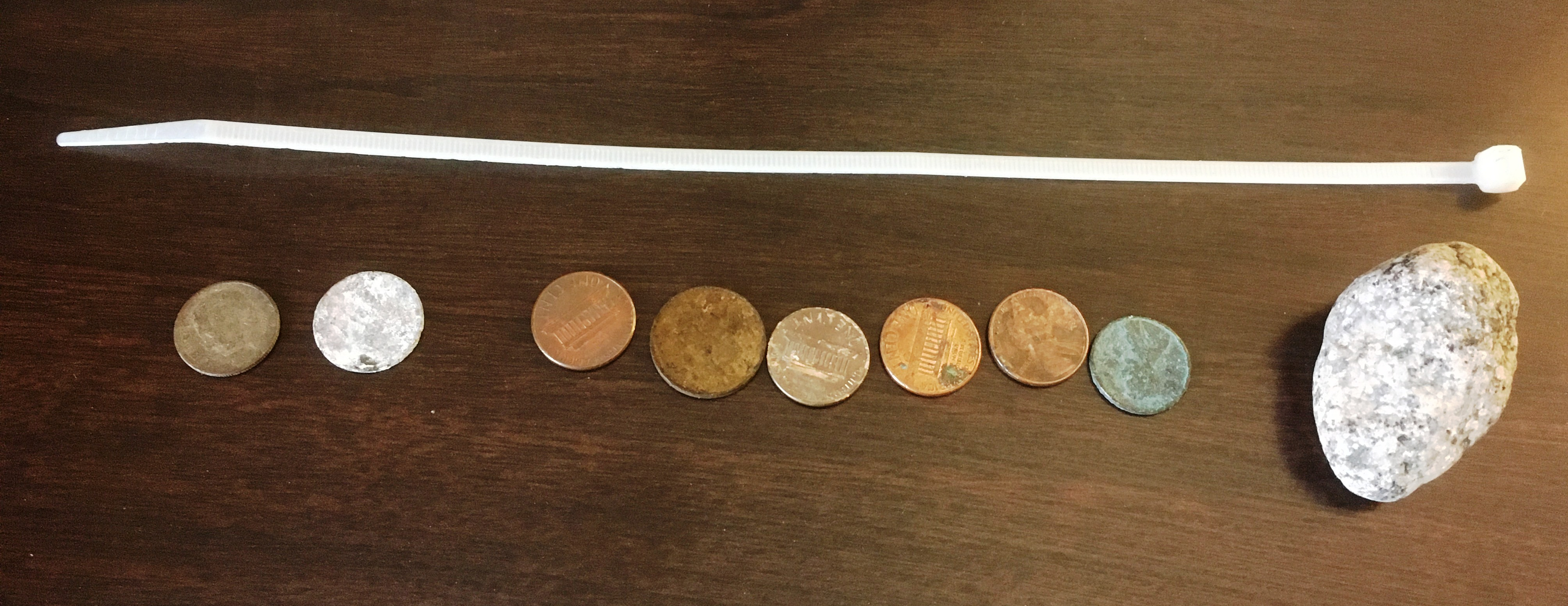I’ll do the math for you. That’s 21 cents (I’m pretty sure the coin second from the left is a nickel), a cable tie with a cash value of about 1 cent, and a speckled rock for my pond area. It could have been 22 cents, but I couldn’t dig out the penny stuck in the tar under the Jack in the Box drive through window.