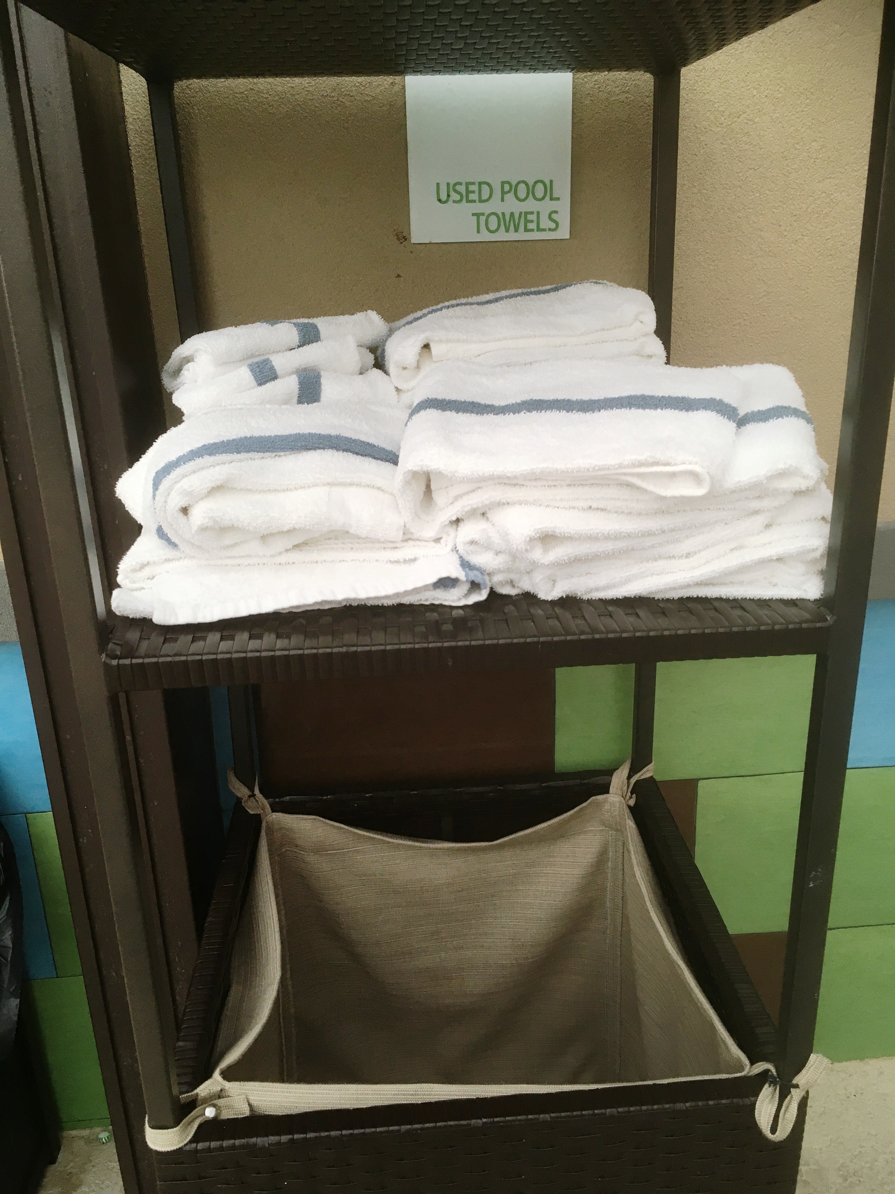 Hmm, the used pool towels were all dry and neatly folded up top by the sign. What I assumed must be the new pool towels were wadded up and still a bit damp in the basket down below. I was confused, but when has that ever stopped me before? And really, who needs a towel?