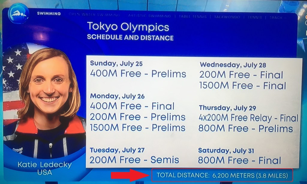 At over 16 miles in, I should have no problem finishing my swim across Lake Michigan without ever swimming in the lake. And if I was an Olympic swimmer like American Katie Ledecky, I could get over half of the rest of the way home just by swimming my events in the Olympics.