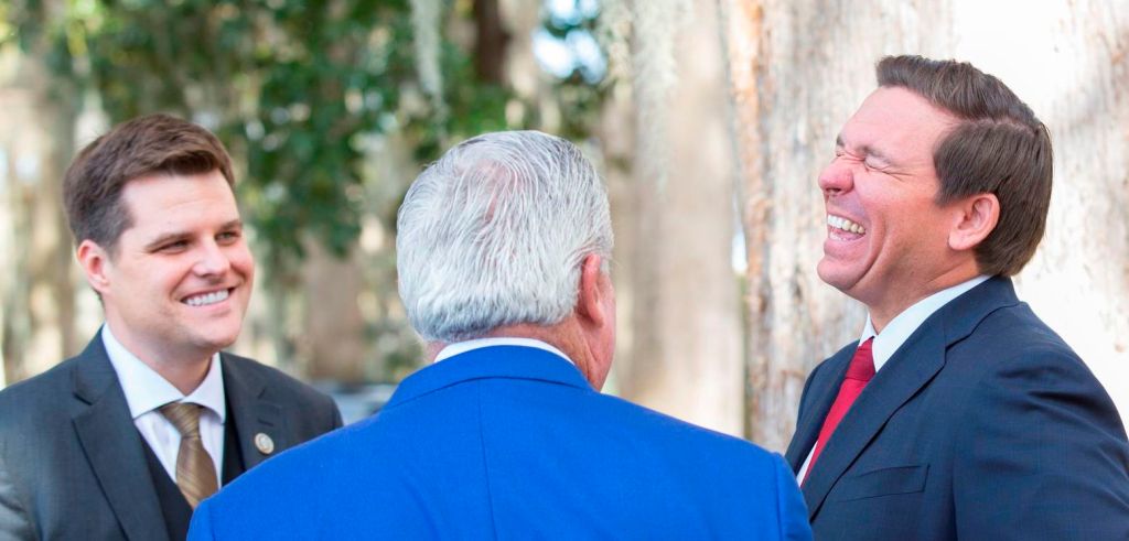 Florida, duh! Of course it is Florida. Did my hint help? Here’s a pic of 2 penis snakes Florida politicians DeSantis and Gaetz. Hey, man in royal blue suit, watch out! That penis snake on the right Ron DeSantis is baring showing his fangs teeth in preparation to bite you laugh.