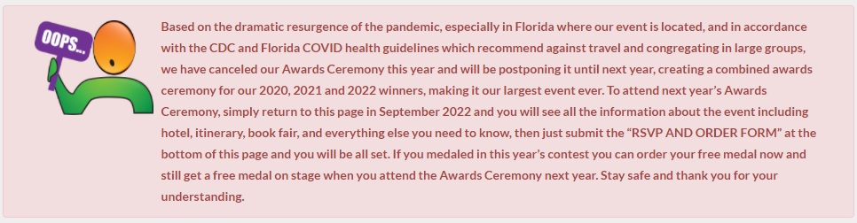 It turns out I get to go to the Awards Ceremony … in Florida … a COVID hotspot. Thanks a lot, FL Gov. Ron DeSantis. I wonder if the 6th place author gets 2 invitations. But I was glad to see that saner heads have prevailed.