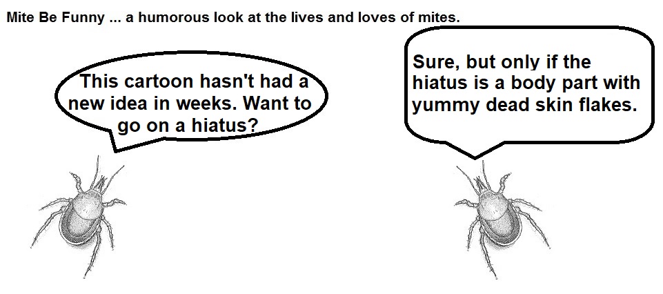Mite Be Funny #247 – Time for a Hiatus? November 7, 2021 ~ Jim Flanigan Share this: Click to share on X (Opens in new window) X Click to share on Facebook (Opens in new window) Facebook Click to share on Tumblr (Opens in new window) Tumblr Click to email a link to a friend (Opens in new window) Email More Click to share on LinkedIn (Opens in new window) LinkedIn Click to share on Pinterest (Opens in new window) Pinterest Click to share on Reddit (Opens in new window) Reddit Click to print (Opens in new window) Print Like Loading... Related Published by Jim Flanigan View all posts by Jim Flanigan