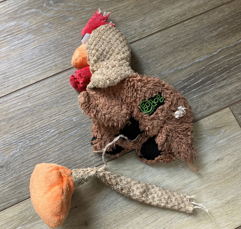 I immediately recognized that toy chicken as very similar to the one our puppy picked out himself at the pet store. My expectation was that our puppy would spend many good times romping with that chicken like the dog is doing in the pic above.
