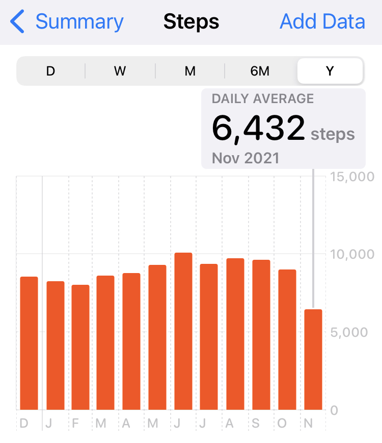 As the second half of November arrived, I thought I was healthy and over my cold. I really did. In hindsight, I was likely too excited about getting my Covid booster shot that I overlooked still being ill. Mistakes were made. I got the shot, and initially I had the normal reaction – sore arm and a little tired. Then, about 36 hours later, I developed a cough. A very Covidy cough. Had they given me the virus rather than the vaccine booster? I just asked for the Covid shot. Maybe I needed to be more specific. Regardless, it did not go well. I was sick for 2 weeks + with a cough and extreme fatigue, as opposed to my normal daily fatigue. I recall getting winded just walking across my backyard cleaning up dog poop. Stupid dogs. Needless to say, my exercise suffered. Take a look at this precipitous drop in steps.
