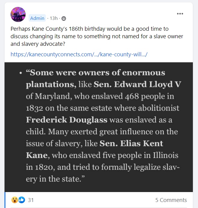 So, Kane County is named after former Illinois Secretary of State (that’s good), US Senator (better and very impressive), and slave owner (oops!), Sen. Elias Kent Kane. Local progressive activists are already working on how to facilitate a name change. They are taking suggestions as to a better name for our county rather than being named after former slave owner (oops!) and ardent slavery advocate (oops, again!), Sen. Elias Kent Kane. Of course, I have suggestions. I offered up two possible name changes. I’m thinking of either Elias County or Kent County. What do you think, better?