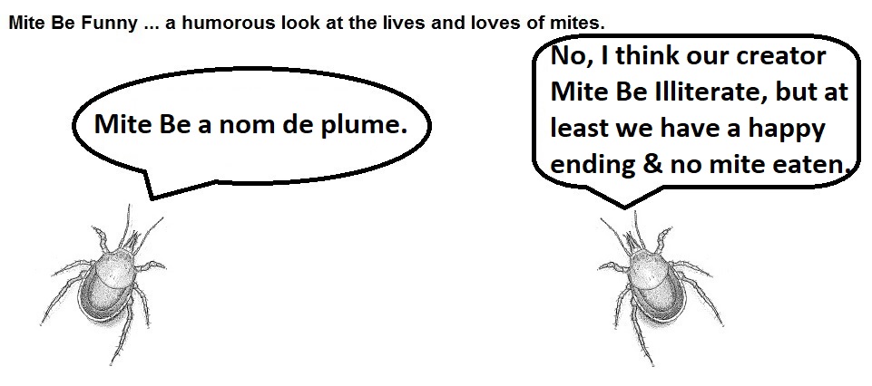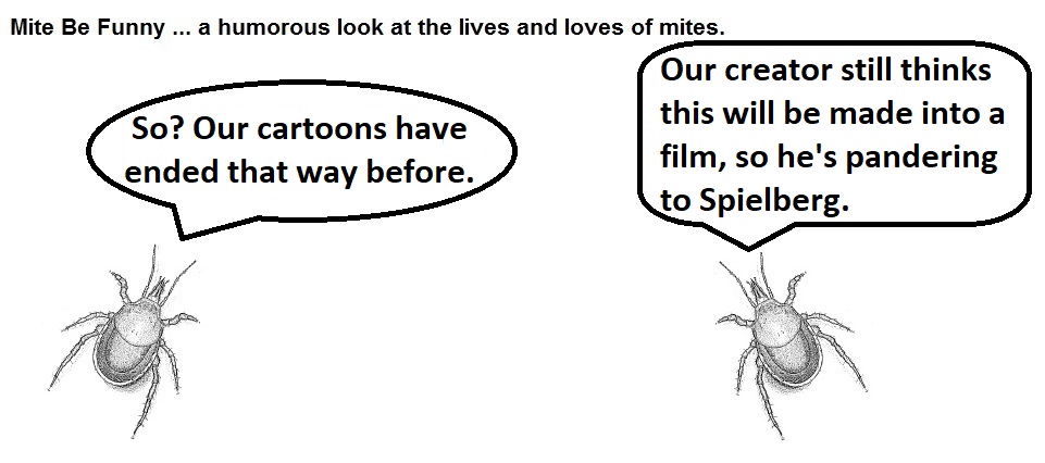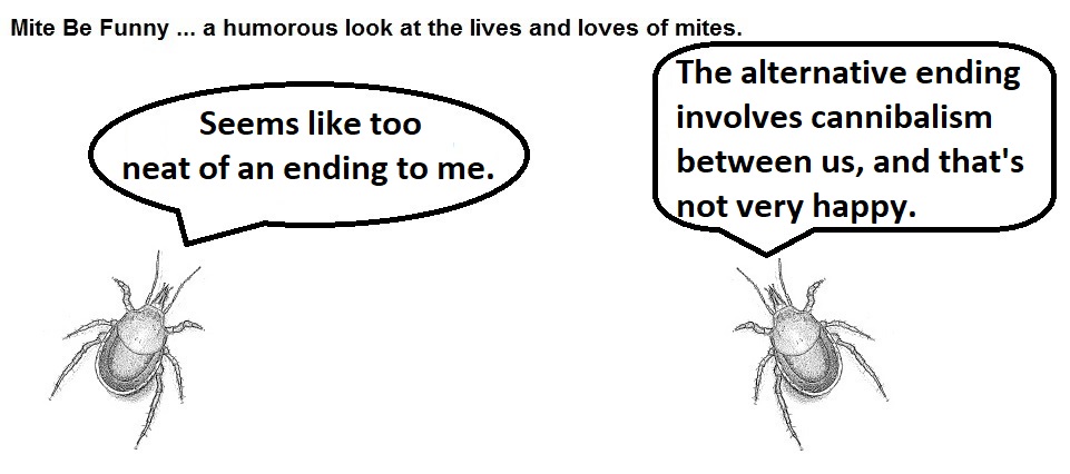 Well, thanks to you readers for using your questionable decision-making skills to reach the end of the Mite Be Funny Laundry Chronicles without reporting this blog to WordPress. And for you weirdos who are disappointed that the story didn’t end in a frenzy of mite-on-mite cannibalism, click here. Happy now?