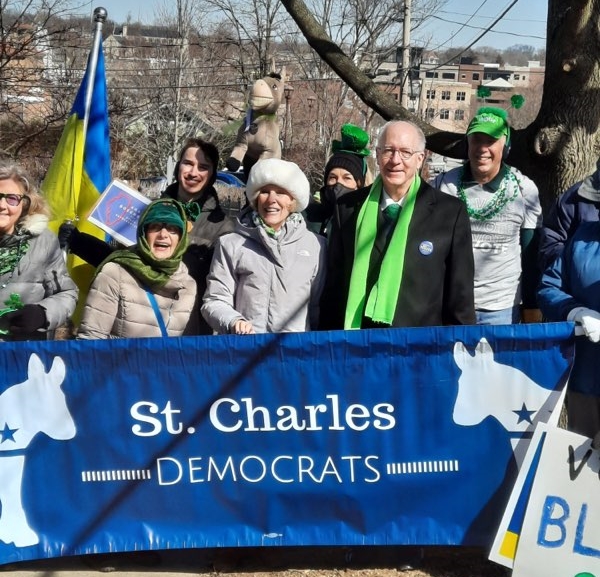 Well, the joke might be on Fassbender after all. I heard they were going to film the St. Patrick’s Day parade for use in the show, and you can guess who was marching in it with the St. Charles Democrats. I’m the one in the pic with shamrock antennae just behind US House Representative Bill Foster with the green scarf.