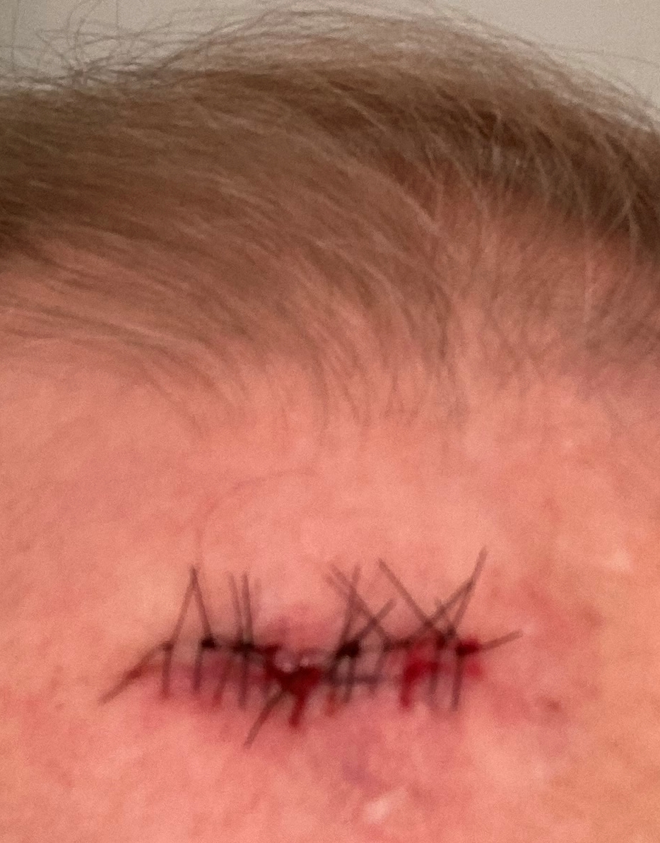 No, that’s not a caterpillar. I count 12 stitches in the middle of my forehead. Surprise! The good news is that my dermatologist said she gave me a bit of a brow lift. I just hope I don’t appear to be in a perpetual state of surprise.