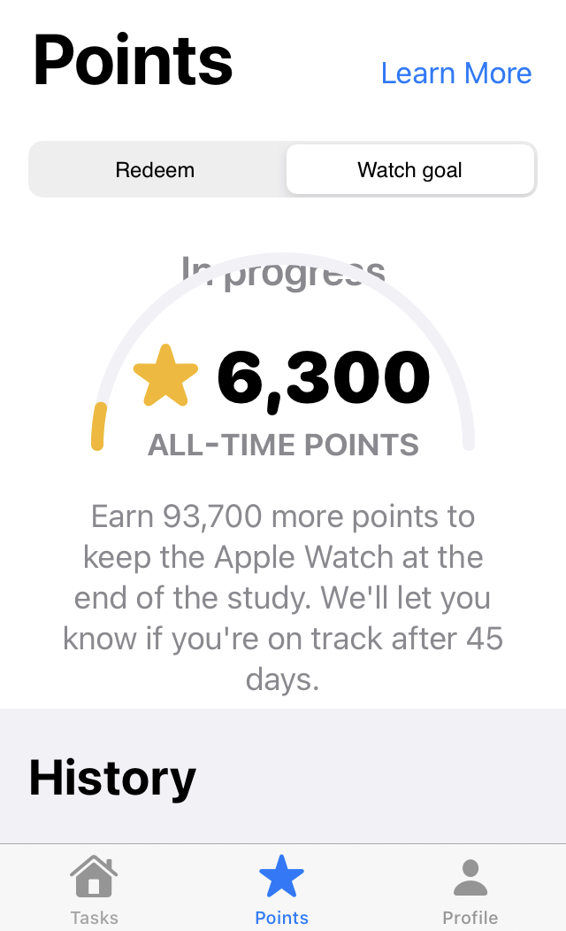 - I have to earn 100,000 points by doing activities and challenges to keep the Apple Watch and earn cash. After some more baseline questions, I started off with these points.