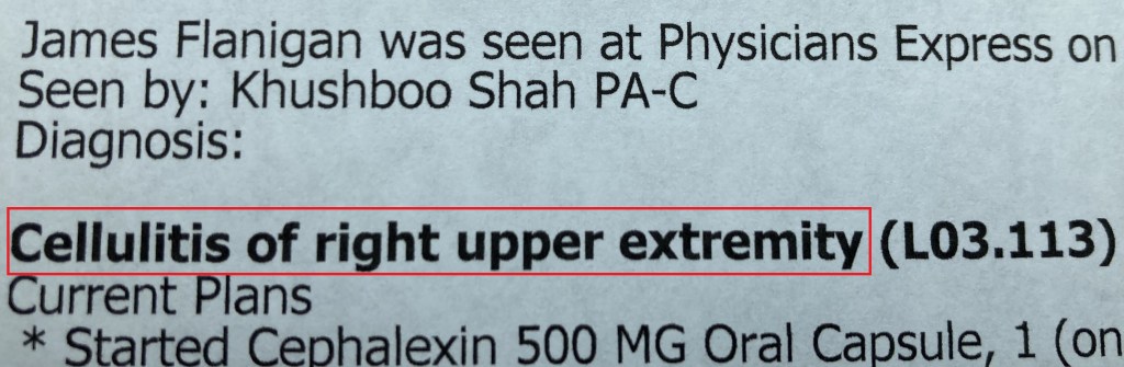 I hate it when my wife is so dogmatic and then turns out to be so right. She didn’t take a very long look at my infected arm before rendering her diagnosis … cellulitis. And she highly suggested I listen to her and seek medical attention before I headed off on a trip to St. Louis. I always value her suggestions, especially when I feel threatened, so I trudged off to the clinic to receive a diagnosis of …