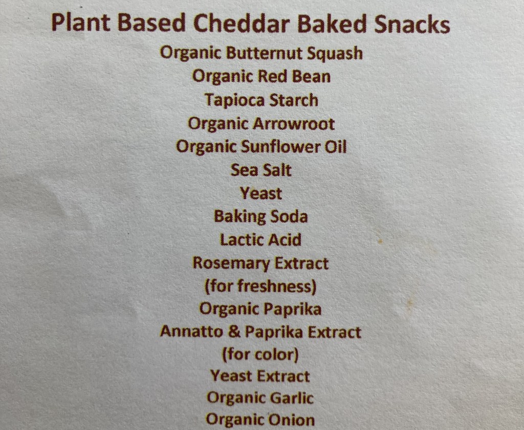 Yep, a cracker. To be fair, there wasn’t just one in the bag. There were plenty of little plant-based crackers for me to nibble on. As I demurely savored each and every one of them, one question haunted me. Aren’t all crackers plant-based? I don’t think they are routinely adding pig snouts to Ritz Crackers as filler. I do recall a short-lived cracker competitor to Ritz called Rots Crackers made entirely of rotting roadkill, but it never garnered a following outside of West Virginia and was pulled from the market. So, I took a look at the ingredient list.