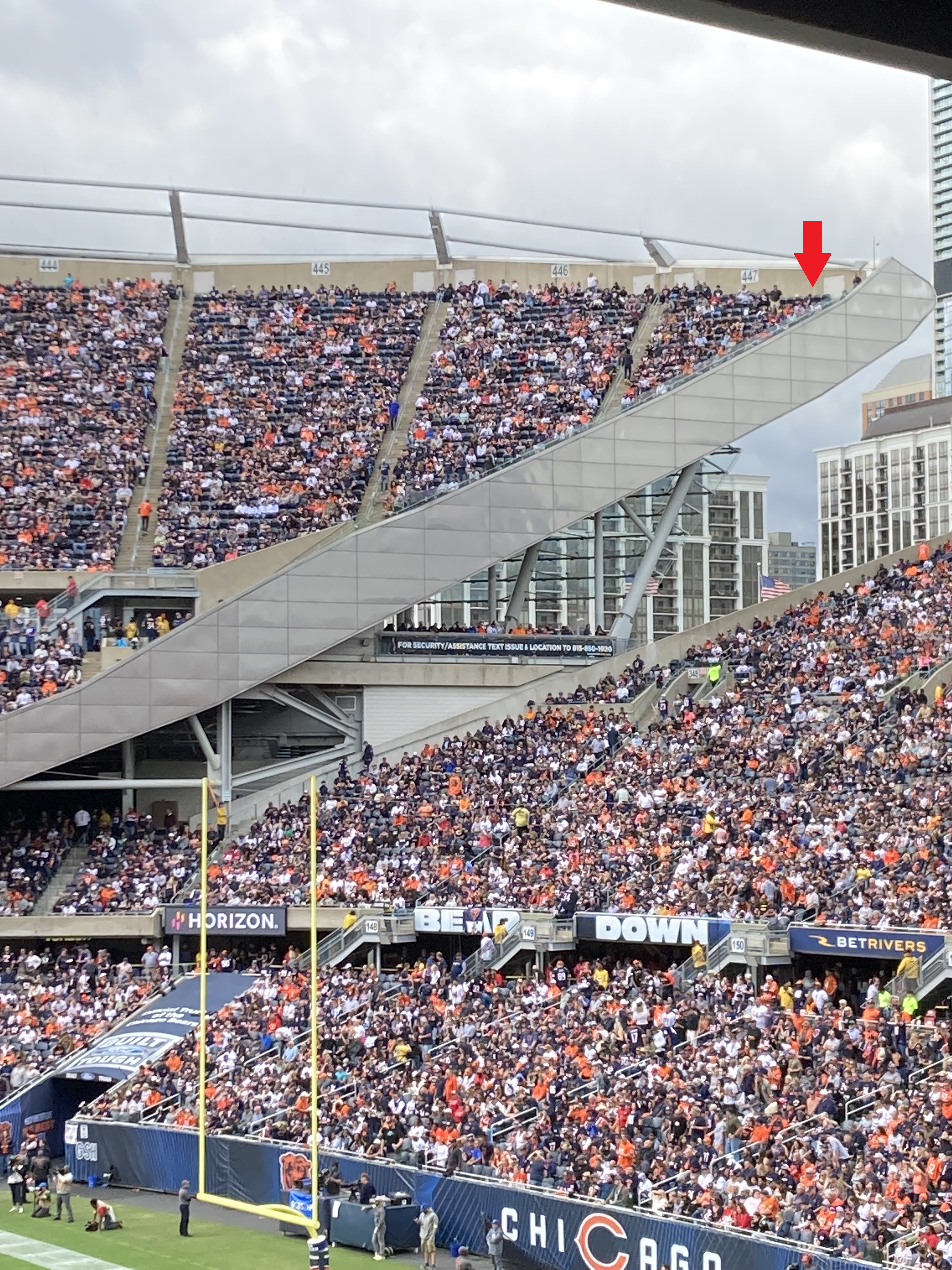 During the game, I became obsessed with the idea of sitting in the farthest corners of the upper deck of Soldier Field rather than in the relative luxury of the covered United Club seats where I was. Why? I don’t have a clue. But I knew I had to explore sitting up here …