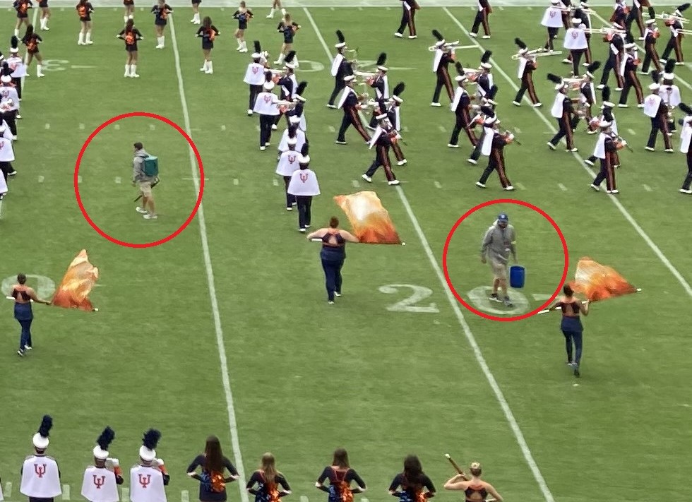 The halftime show was an excellent traditional display of music and movement by the 400+ member University of Illinois Fighting Illini marching band. Except maybe for these 2 guys …