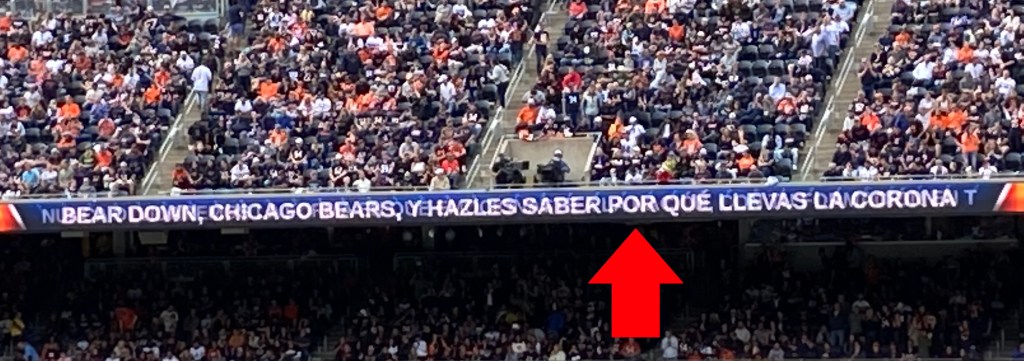 When the Bears score, which tends to be rare this year, the fans stand and sing the Bears fight song. Lyrics are shown on the screens for the more inebriated fans to try to read. However, last Sunday was a day celebrating the local Latin community, so this is what we saw.