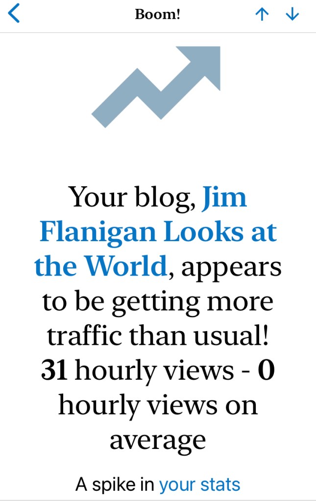 I have noticed a recent uptick in views and likes of this blog. What’s wrong with you readers? I’d prefer to watch TV. Come to think of it, clipping my toenails may interest me more than this blog. Anyway, I received this notification from blog host WordPress.