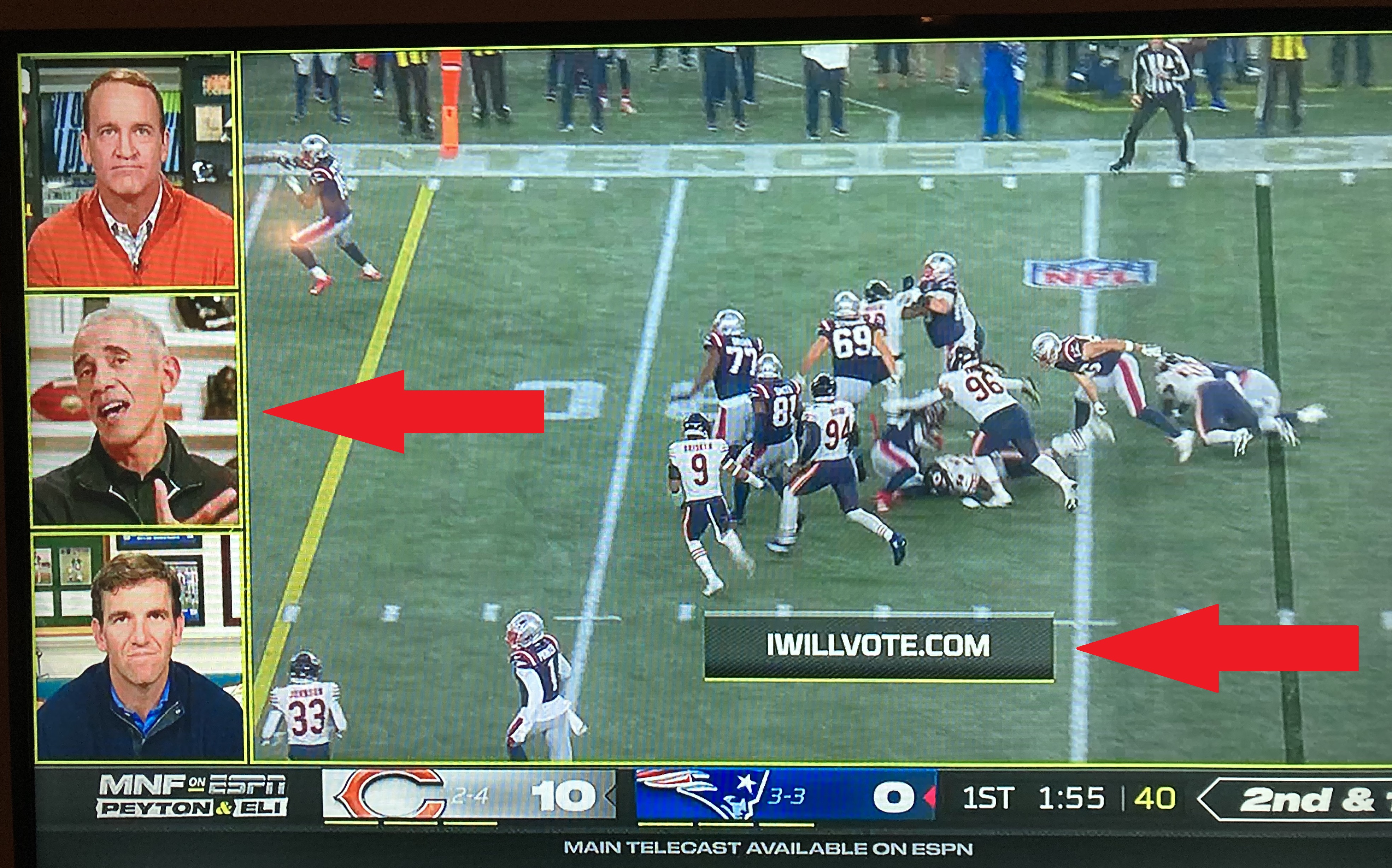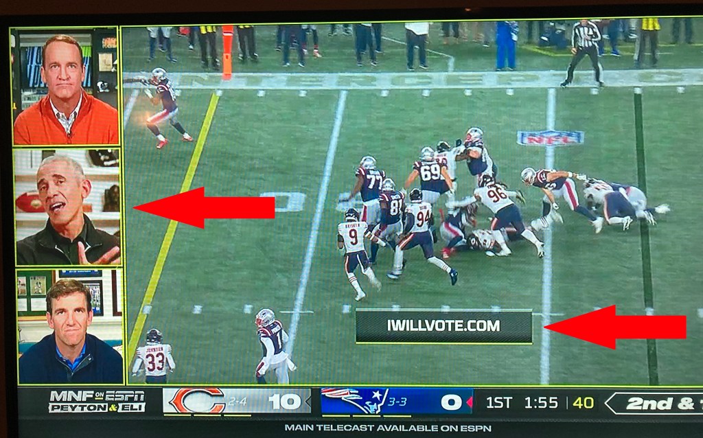 I think I finally understand the complaints about the liberal media. It all became perfectly clear as I watched my beloved Chicago Bears dismantle the New England Patriots on Monday Night Football last night. Take a look at who Peyton and Eli Manning had as a guest on their Manningcast.