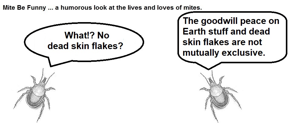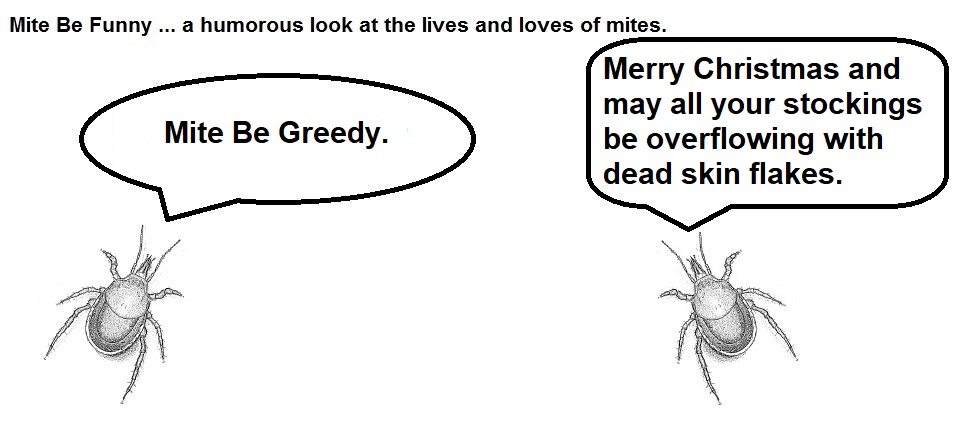 Mite Be Funny #301 – A Mite Christmas Message December 23, 2022December 23, 2022 ~ Jim Flanigan To make up for the cessation of regularly-scheduled Mite Be Funny cartoons every Sunday, here’s an extra long, 5-panel cartoon with a Christmas message from the mites on this Tenth Day of Blogging. Share this: Click to share on X (Opens in new window) X Click to share on Facebook (Opens in new window) Facebook Click to share on Tumblr (Opens in new window) Tumblr Click to email a link to a friend (Opens in new window) Email More Click to share on LinkedIn (Opens in new window) LinkedIn Click to share on Pinterest (Opens in new window) Pinterest Click to share on Reddit (Opens in new window) Reddit Click to print (Opens in new window) Print Like Loading... Related Published by Jim Flanigan View all posts by Jim Flanigan