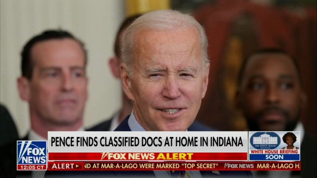 I wonder exactly where they were discovered. Reports say in an unprotected area, so certainly not in Mother’s knickers. I find it interesting to see how Fox News is presenting visuals about the story of the Pence classified docs.