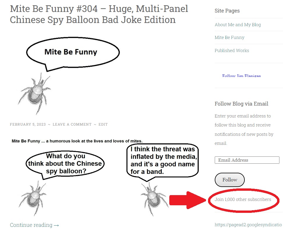 I’ve reached a blogging milestone. I saw this when I logged onto this blog to check on my last pseudo-hilarious Mite Be Funny cartoon.