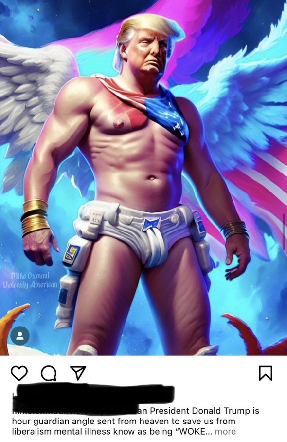 Twitter is abuzz with rumors of Trump’s possible arrest tomorrow, so pics like the above are surfacing to glorify Trump as a martyr complete with a scar from his side being pierced during his political crucifixion. I have so many questions about so many parts of that pic, but let’s start with the caption.