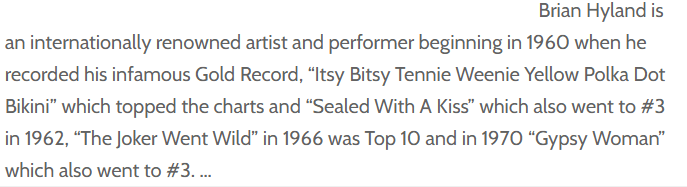 I remembered Brian Hyland as a one hit wonder with “Gypsy Woman.” But wait, before “Gypsy Woman,” he was a teen idol with hits.