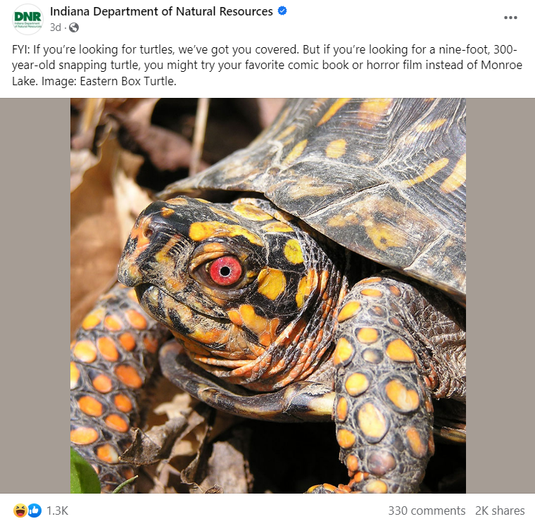 To put an end to the wave of turtle terror gripping Monroe County, the Indiana Department of Natural Resources felt compelled to post this …