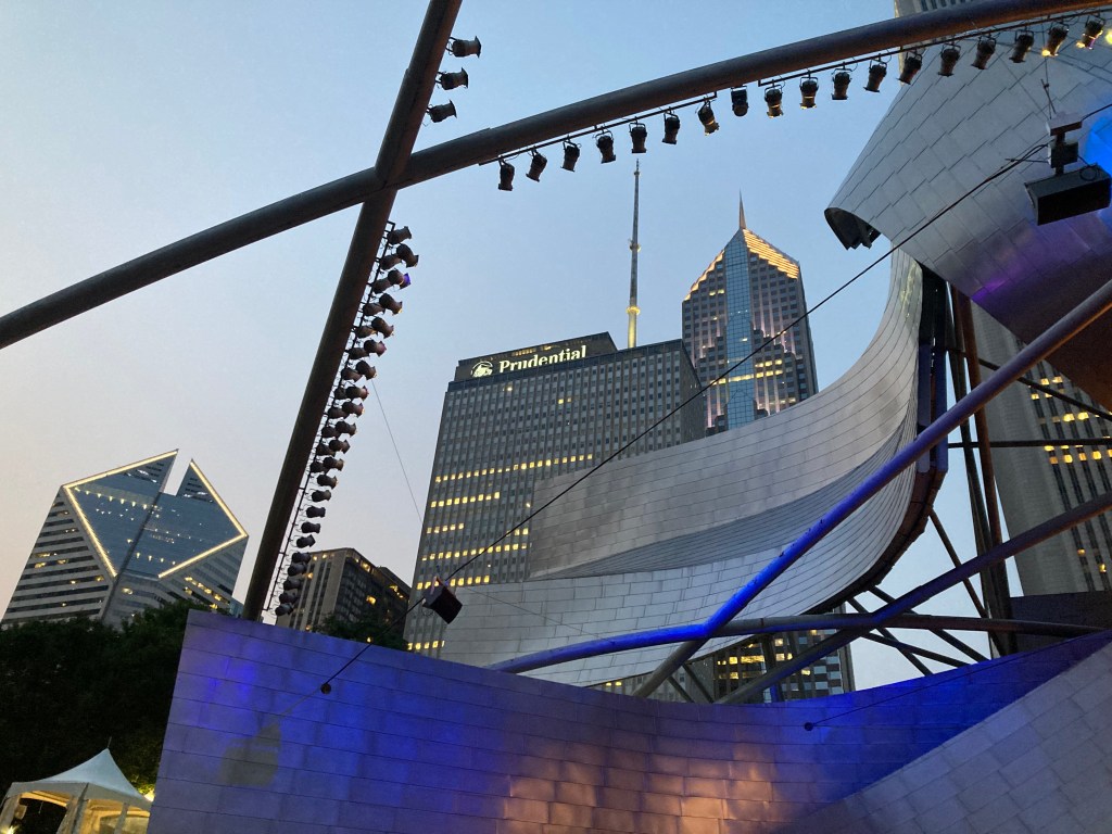 Any song with the word exoskeleton as part of the lyrics is okay by me. It was a great night, and I even indulged in some touristy activities by taking some pics. Here’s an interesting shot of angles, curves, and some iconic Chicago buildings from my seat during the concert.