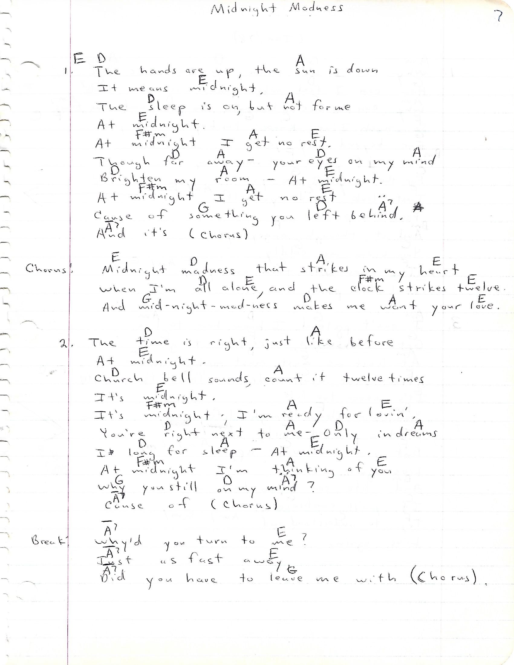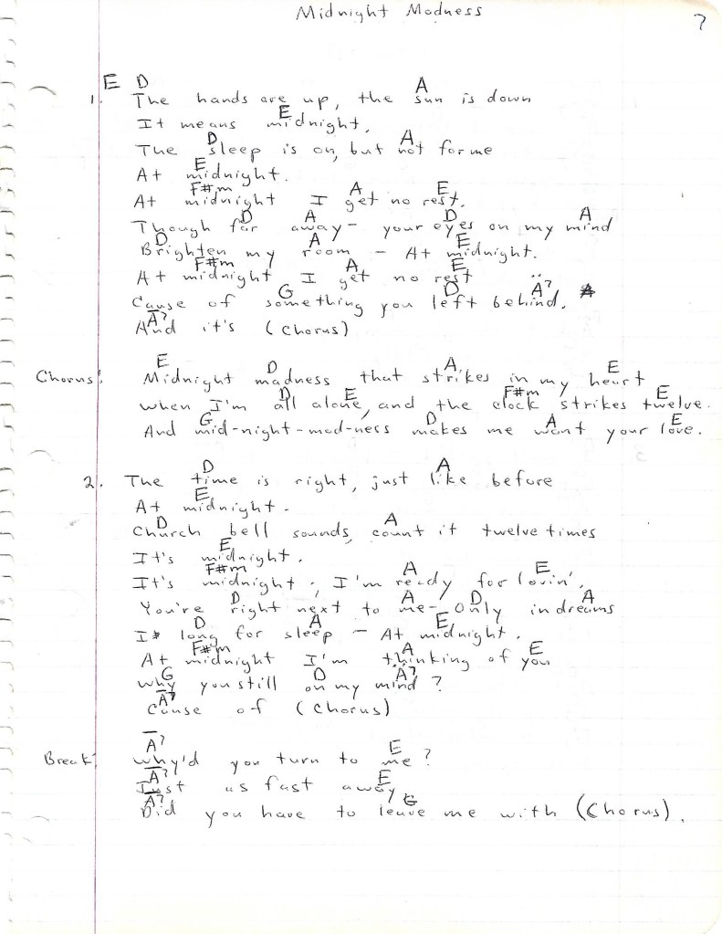 Not only do you get to hear my dulcet tones as I interpretively read “Midnight Madness,” but now you can play along on your guitar! Here is my written version from decades ago with simple guitar chording so you too can play “Midnight Madness” as I did sitting on my bed in my lonely childhood bedroom, feverish with an actual confirmed case of midnight madness.