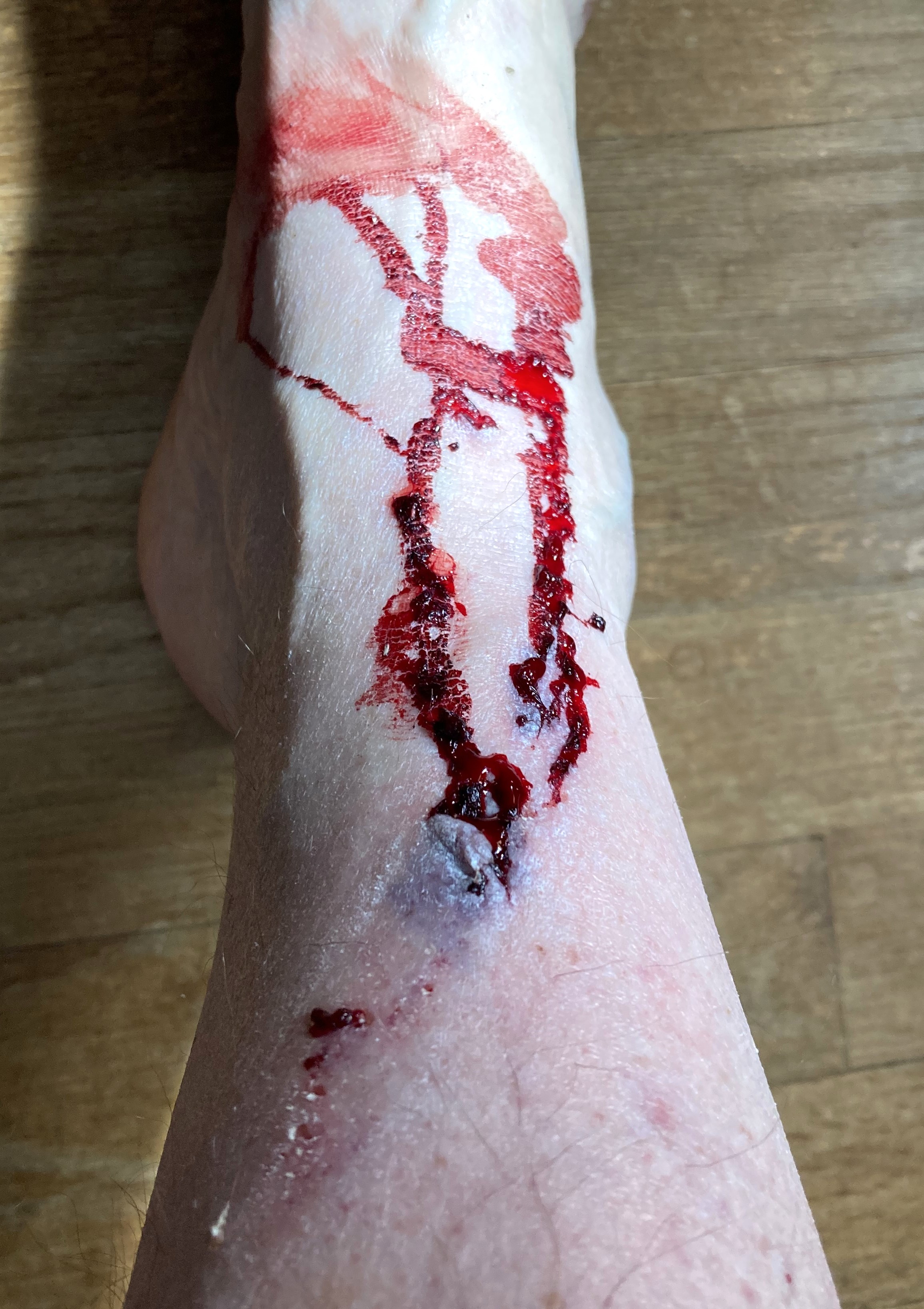I felt like a serial killer as I showered and watched the water run red off my leg. That and knowing I have a body in the freezer. Stop calling the police! It’s just a frozen chicken in the freezer.