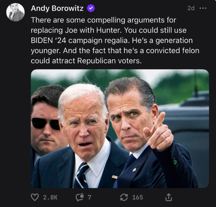 Democrats need to swing some Republican voters, and Hunter’s felony convictions could be the key to attract some Rs. Although there’s still time for Joe to step up and commit some blatant crimes. Now that he’s got immunity per the Supreme Court, he can do whatever he wants. It just might get him re-elected.