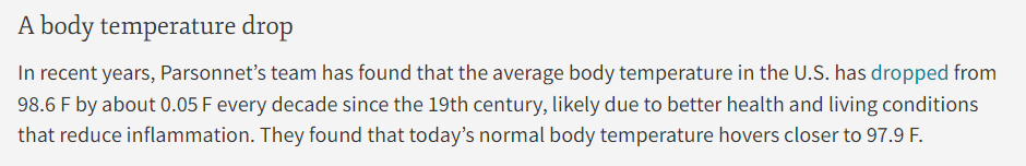 For the full “scientific” article from Stanford “Medicine,” link HERE. For those of you reading in distant, faraway, backward nations like Wakanda and Atlantis that still use the antiquated Celsius temperature scale, the Stanford “doctor’s” “research” shows the normal body temp has dropped from 37C to 36.6C. Well, welcome to my world.
