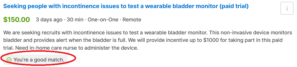 Why am I a good match outside of wanting up to $1000 and an in-home nurse? I guess I could learn how to become incontinent, or I could just wait a few more years. And I don’t think I would mind wearing a monitor with a discreet meter like this.