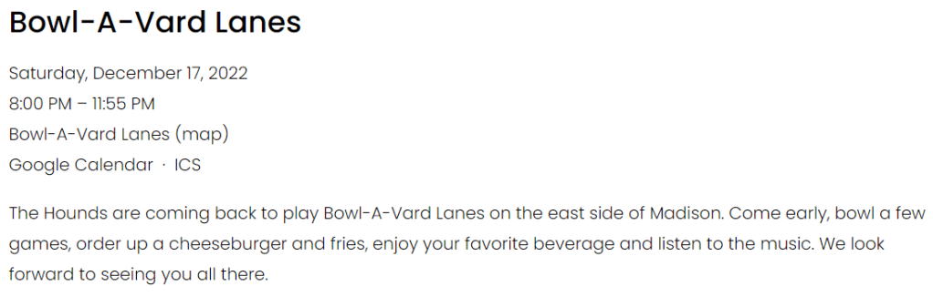 Back in my younger days, I knew it was the weekend and time to party when Chicago radio station WXRT 93.1FM played Another Drugland Weekend by local band The Hounds at 5PM on Fridays. If not for that song, I’d probably still be in the church choir today. If you missed The Hounds in the 70s, don’t fret. You can catch them later this month playing in a bowling alley just across the border in Madison, Wisconsin. Really!