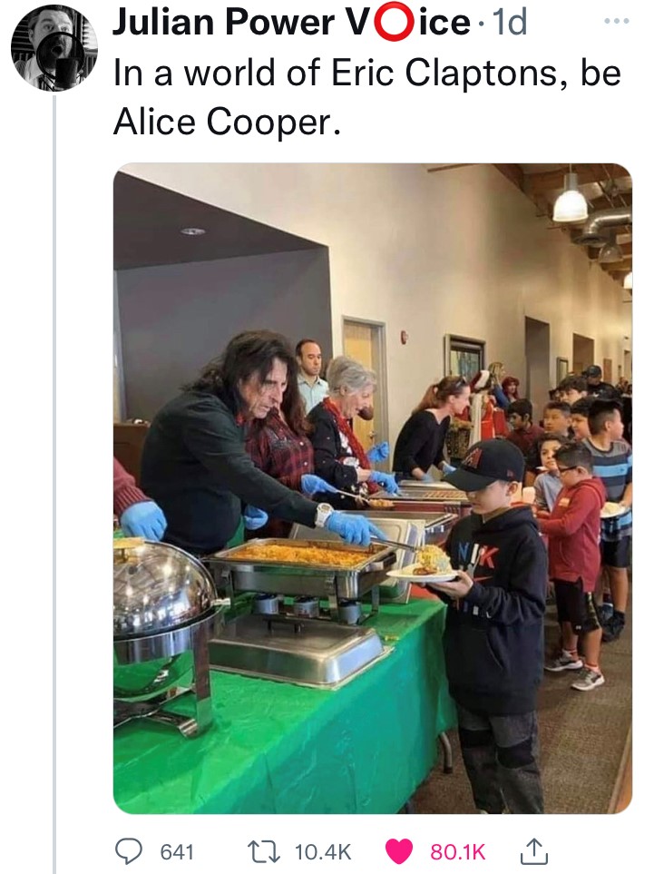 First thing I did was try not to be such a dick when I was out shopping and running errands. I was inspired by this older pic of Alice Cooper serving others that resurfaced and made the rounds on Twitter recently.