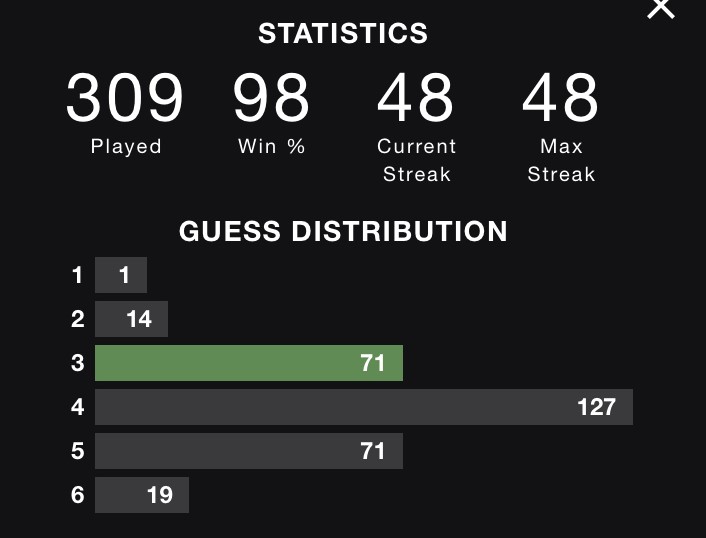 I use Wordle to wake up and get my brain working in the mornings. This is before any caffeine or other stimulants that are typically found around most American homes like bennies, coke, crank, uppers, blow, speed, snow, etc. have entered my body. Consequently, I sleepwalked through many Wordle gaffes that I should have avoided had I actually thought about my guess rather than randomly mashing the keyboard until I make a word. I’m kind of a 4-try guy in Wordle, but those numerous early-morning Wordle goofs ran up my 5-try tally well beyond my 3-try total. Well, as of this morning, I am pleased to report that my 3-try and 5-try totals now match.
