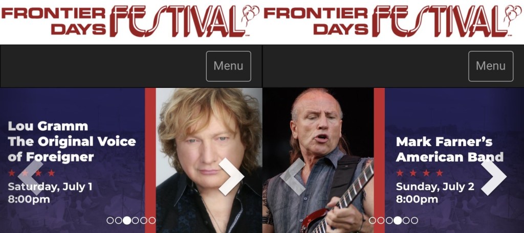 Frontier Days doesn’t really take place on the frontier, but in Arlington Heights, a suburb of Chicago. It’s not that far, but I wasn’t up for a drive on consecutive evenings. We had to pick one. The setlists were compelling. Here’s a link to Gramm’s setlist featuring a veritable hit parade of familiar Foreigner tunes. Here’s the link to Farner’s setlist featuring slightly older Grand Funk hits.