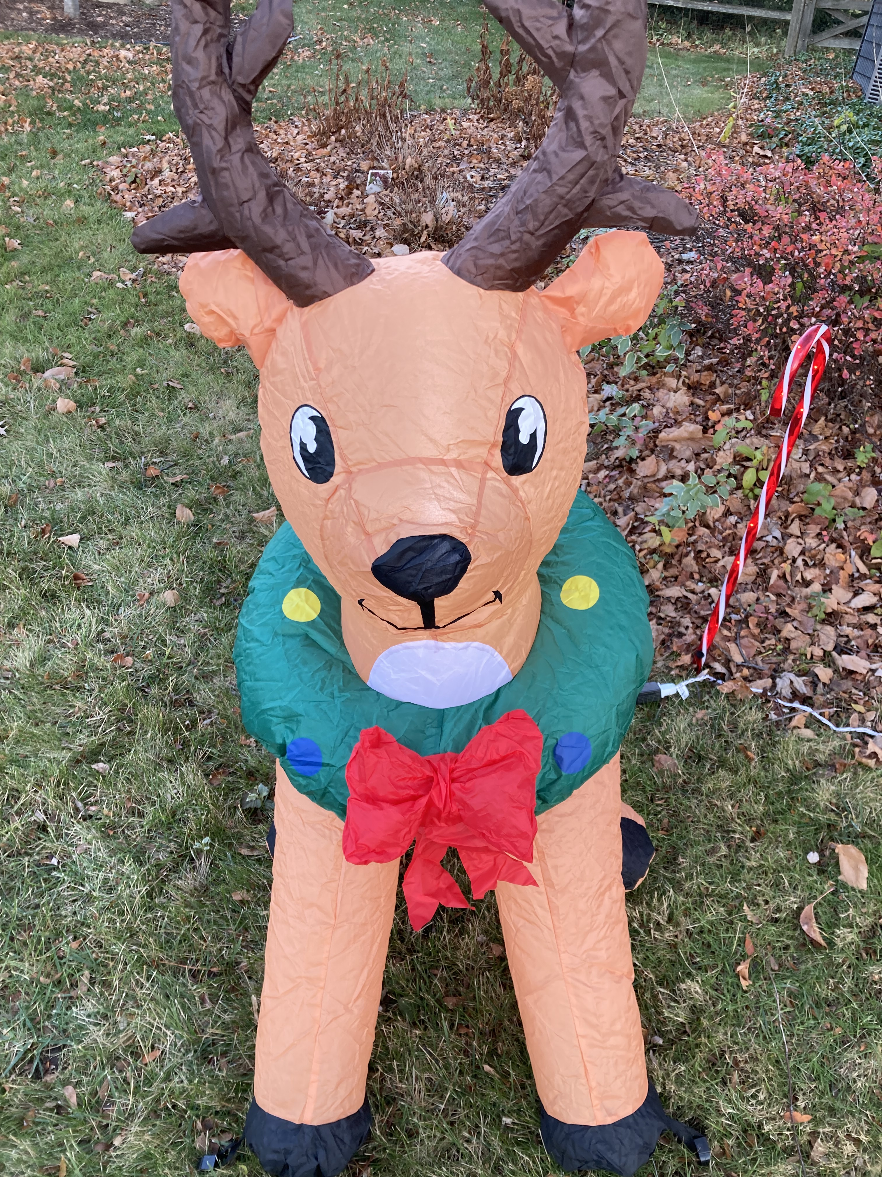 It snowed last night and into this morning. I am glad that we put up holiday decorations yesterday when it was a mild day with some sun. However, after getting this inflated, I am moved to ask a question. Is it traditional for reindeer to wear life preservers at Christmas?