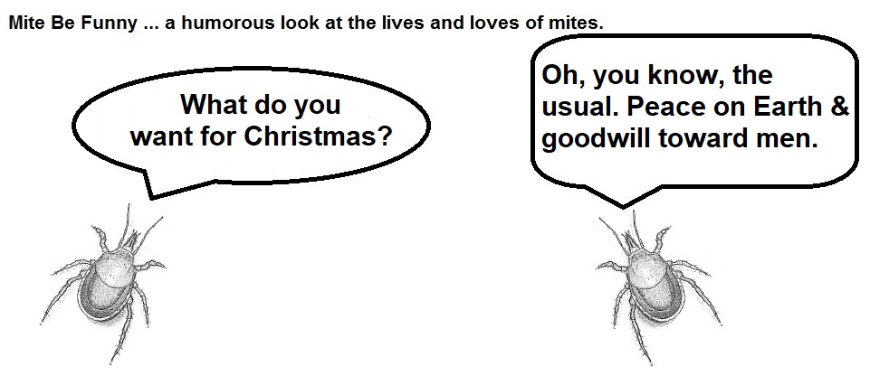 To make up for the cessation of regularly-scheduled Mite Be Funny cartoons every Sunday, here’s an extra long, 5-panel cartoon with a Christmas message from the mites on this Tenth Day of Blogging.
