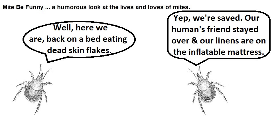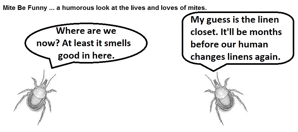 Anyhoo, when last we left this stirring adventure that has generated some film interest, our impavid (go ahead, look it up, it’s a real word) mites were facing starvation trapped in a linen closet. Read on to discover the lackluster conclusion to the Mite Be Funny Laundry Chronicles.